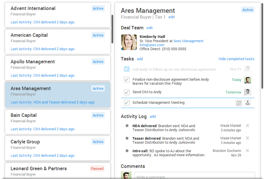Designed from the ground up to work specially within the investment banking workflow. Whether your advisory firm focuses on sell-side or buy-side, MadeMarket is designed to make your firm more efficient. Managing your deal pipeline has never been easier.