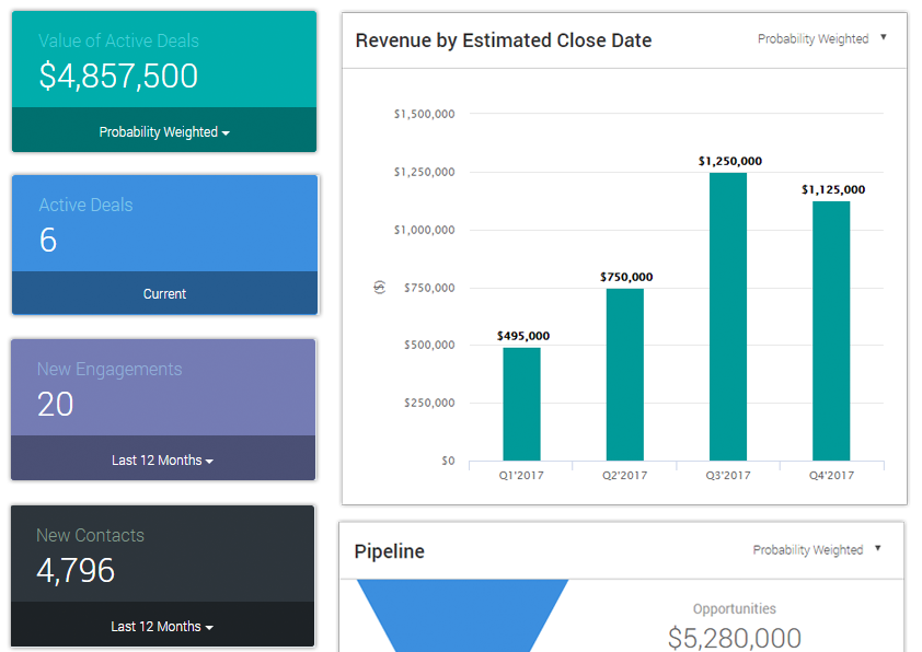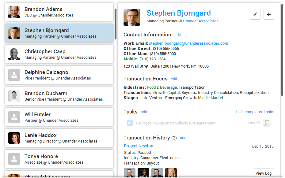 Maintain your firm's contacts securely in a centralized location. Integrated with Microsoft's Office 365 & Exchange 2016. Sync contacts and log emails directly to deals and opportunities. We also recently introduced a Zapier integration that allows countless 3rd party integration such as Constant Contact and Mailchimp.